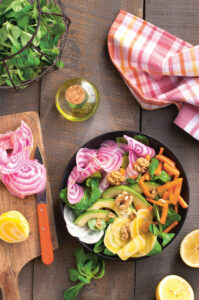 Salade de betteraves rôties et noix avec du fromage de chèvre et une vinaigrette à l’orange ou soupe de lentilles corail et carottes épicées avec du cumin.