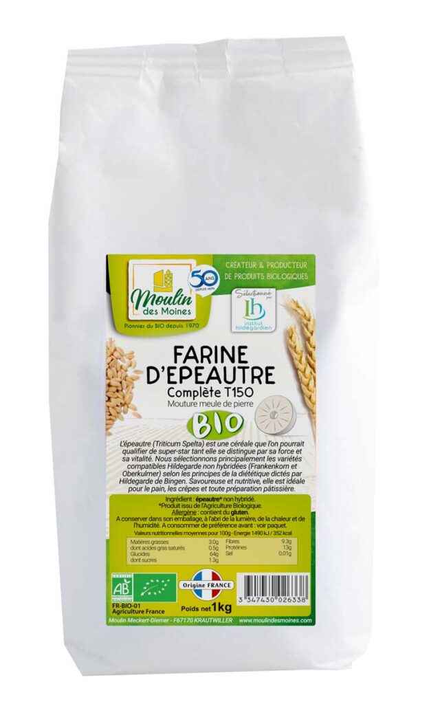 La farine d’épeautre est moins riche en gluten que la farine de blé et elle est plus riche en fibres, en vitamines et en minéraux. Elle est recommandée pour le pain, les galettes et les sablés.