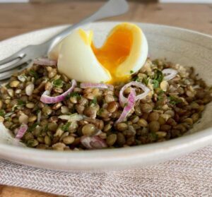 Salade de betteraves rôties et noix avec du fromage de chèvre et une vinaigrette à l’orange ou soupe de lentilles corail et carottes épicées avec du cumin.